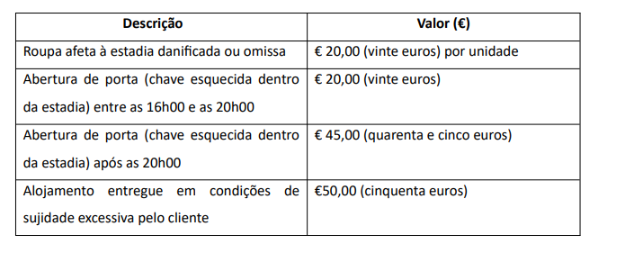 4. Qualquer espaço utilizado pelos hóspedes durante a sua estadia, bem como todos os objetos e serviços colocados à sua disposição, devem ser tratados com cuidado, zelo e respeito, assegurando também a prática de uma boa higiene, devendo, após a sua estadia, os espaços apresentarem as condições mínimas que foram inicialmente asseguradas no momento de entrada na estadia.